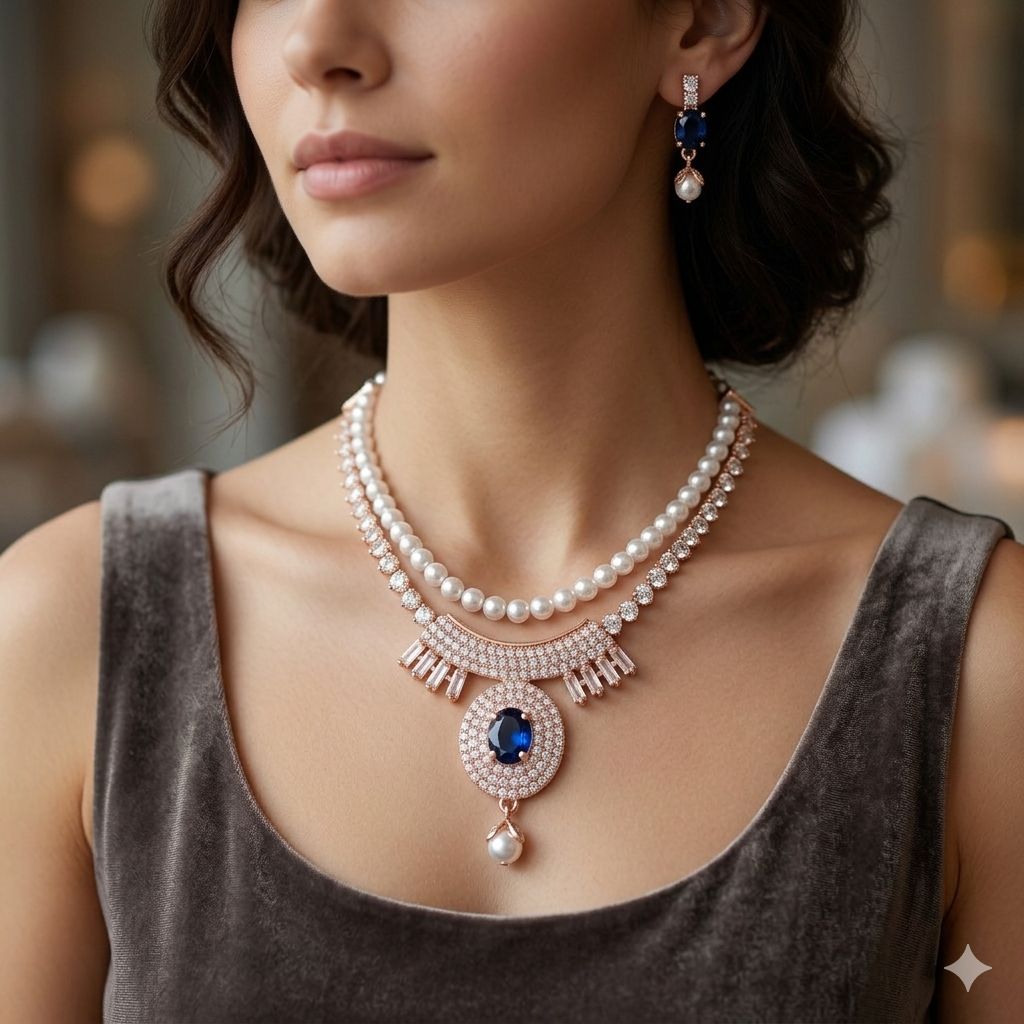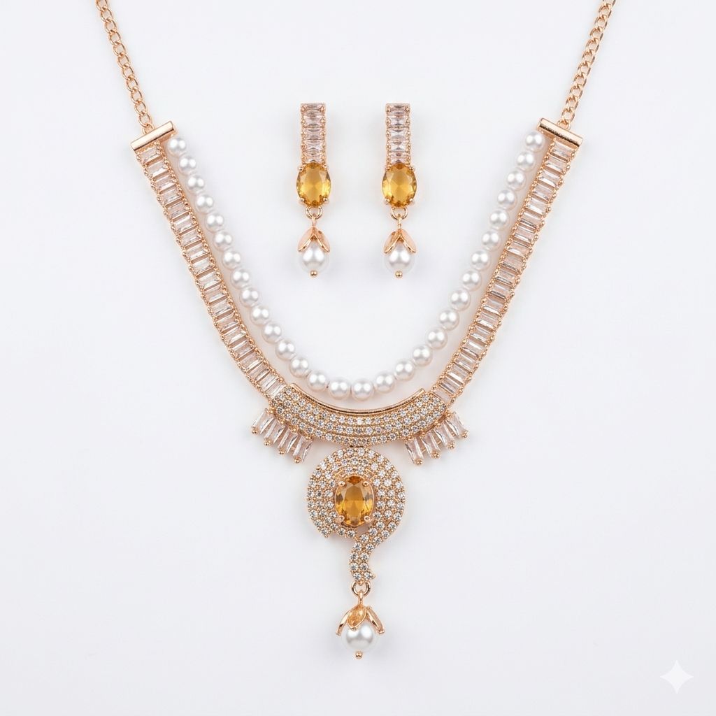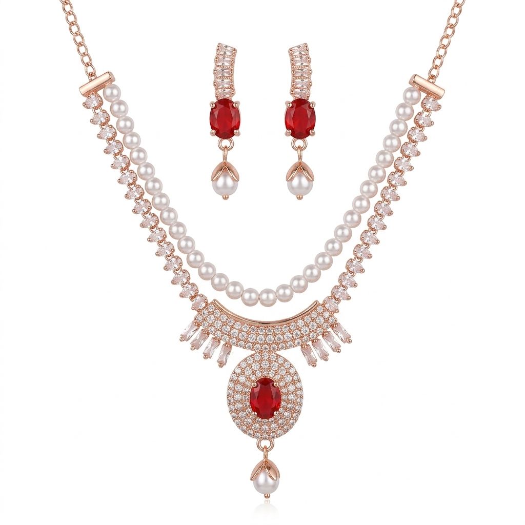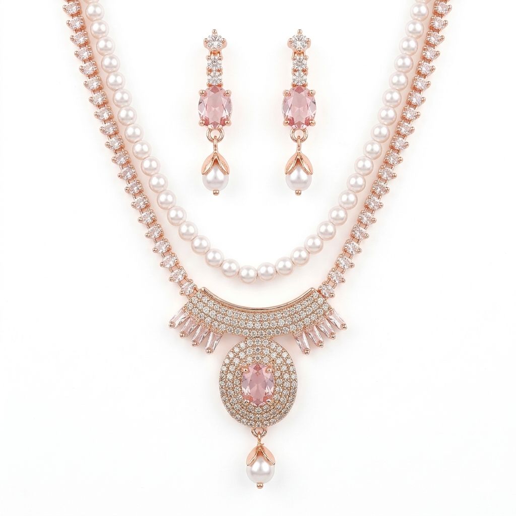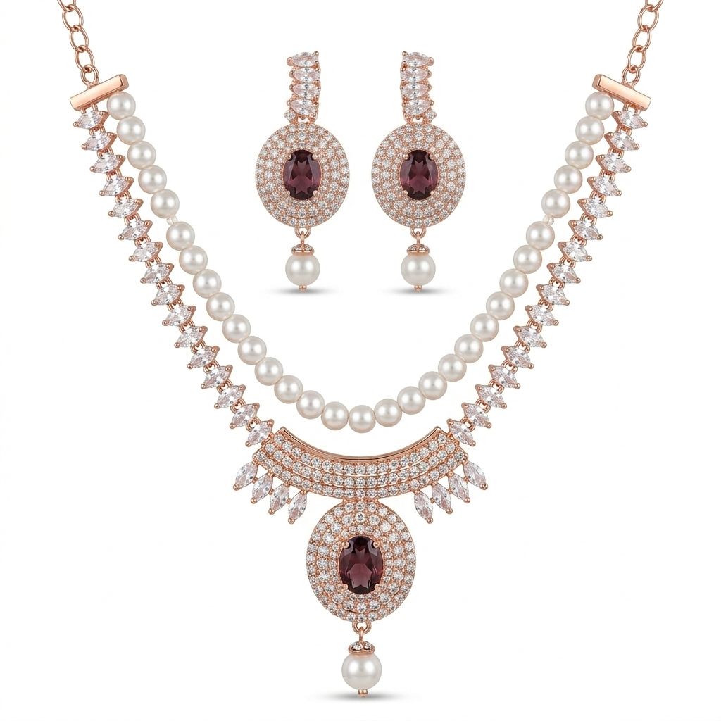 Premium Stone & Pearl Necklace Set for Women with Earrings | Rose Gold Plated Designer Jewelry | Wedding, Party & Bridal Wear
