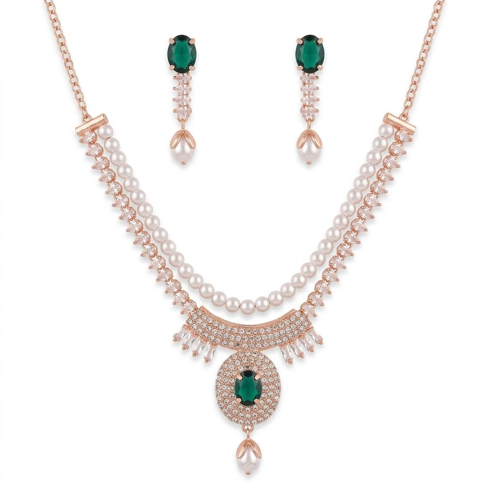 Enhance your elegance with this beautifully crafted emerald green stone and pearl necklace set. Designed with a luxurious rose gold finish, this jewelry set features a stunning central pendant adorned with sparkling stones and a pearl drop. The matching earrings perfectly complement the necklace, making it ideal for weddings, parties, festive occasions, and bridal wear.