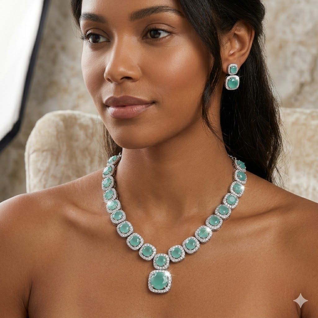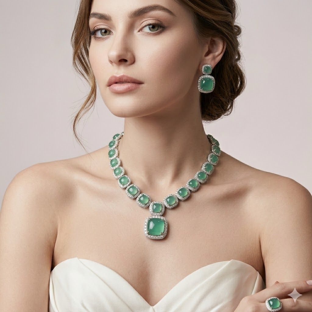 Premium Green Stone Necklace Set with Earrings Elegant Silver Finish Designer Jewelry | Wedding, Party & Bridal Wear